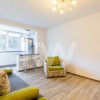 Livingul este spațios și modern, mobilat minimalist, care oferă un contrast elegant. Piesa de rezistență este zona de relaxare, cu o canapea și un fotoliu în nuanțe de verde crud și motive florale, care aduc un plus de prospețime și energie camerei.