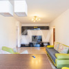 Un mare avantaj al acestui apartament este mutarea bucătăriei în zona logiei. Această soluție inteligentă nu doar că a eliberat spațiul, dar transformă gătitul într-o plăcere, beneficiind de lumină naturală din abundență datorită ferestrelor mari. Bucătăria este complet mobilată și utilată și dispune chiar și de un mic bar pentru micul dejun, perfect pentru cafeaua de dimineață cu privire spre spațiul verde.