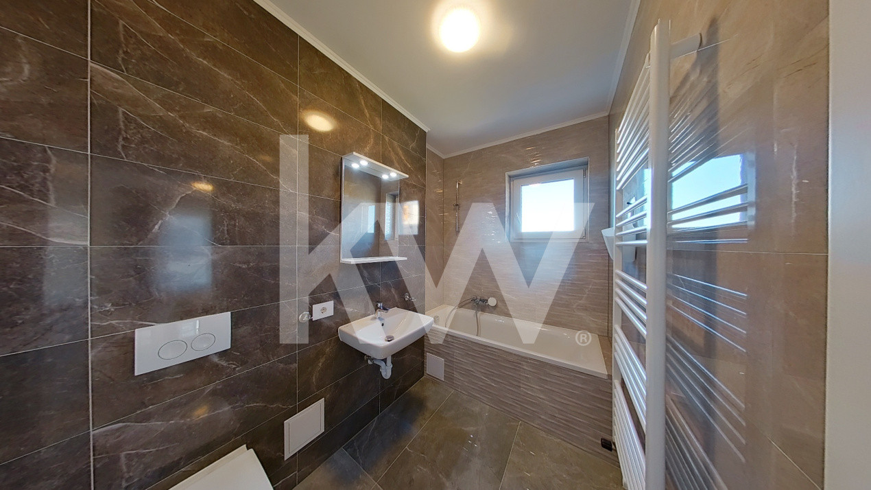 Continuam cu 2 dormitoare insorite si luminoase, orientarea lor fiind una estica, 2 bai dintre care una este prevazuta cu cabina de dus iar cealalta cu cada, 2 holuri si o debara.