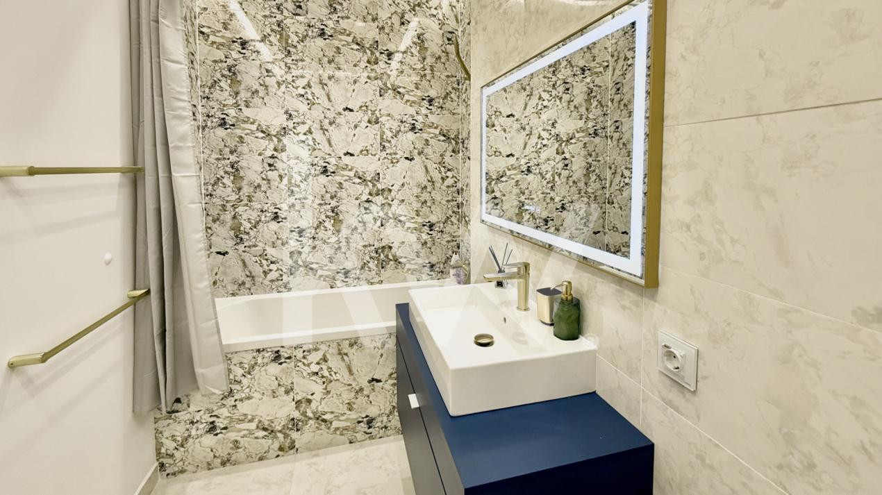 Zona de living cu bucătărie open-space este complet mobilată și utilată, iar mobilierul este de înaltă calitate, ales cu atenție la detalii. Finisajele premium și compartimentarea echilibrată creează un ambient modern și elegant. Dormitorul matrimonial este amenajat pentru confort, iar a doua cameră reprezintă un avantaj important: aceasta poate fi reconfigurată pe cheltuiala proprietarului în dormitor suplimentar, dressing sau birou (office), în funcție de nevoile viitorului chiriaș.