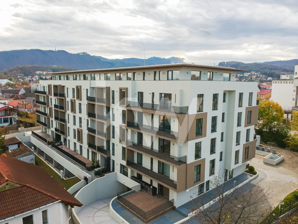 Apartamentul se bucură de o locație deosebită, oferind o vedere panoramică asupra munților Brașovului și fiind în proximitatea tuturor facilităților orașului, inclusiv restaurante, magazine, școli și alte servicii.