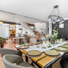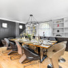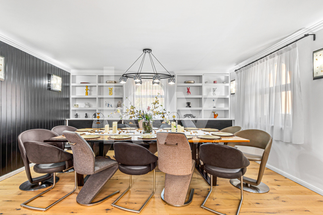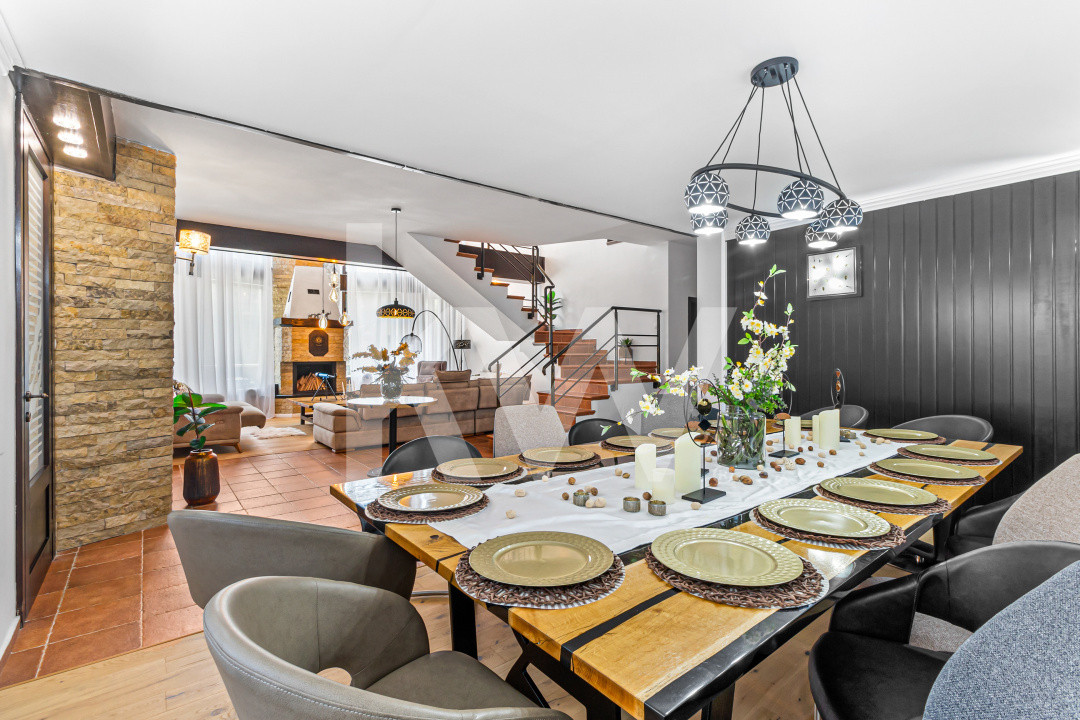 • Zonă de dining cu masă din stejar personalizată pentru 14 persoane, ideală pentru evenimente și cine rafinate