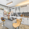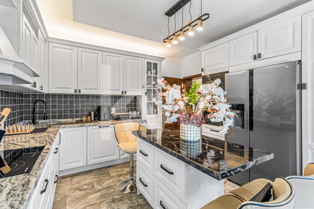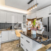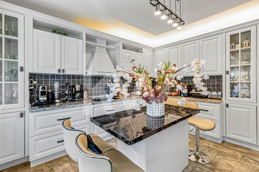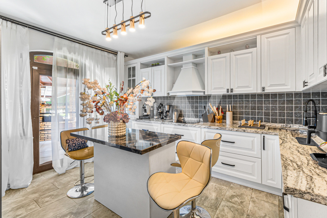 • Bucătărie complet utilată cu mobilier din lemn masiv de stejar, blat marmură, electrocasnice încorporate (inclusiv microunde electric, frigider), dulapuri soft-close