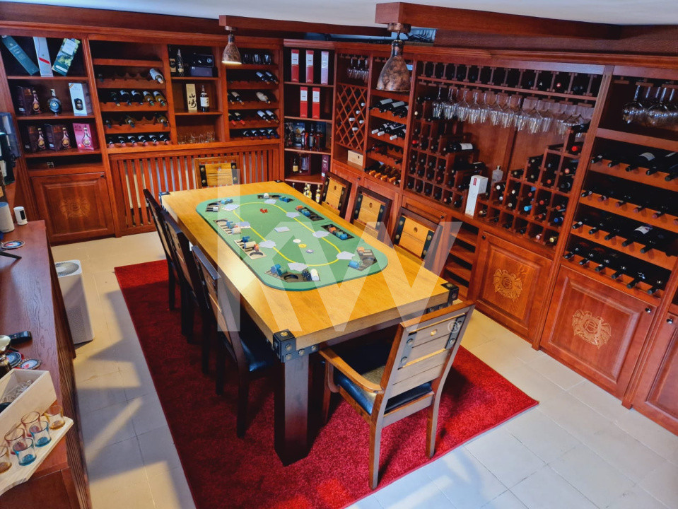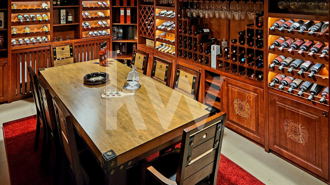 • Cramă cu mobilier din lemn masiv cu frigider pentru vinuri și trabucuri, izolată fonic, chicinetă cu mașină de vase și boiler room