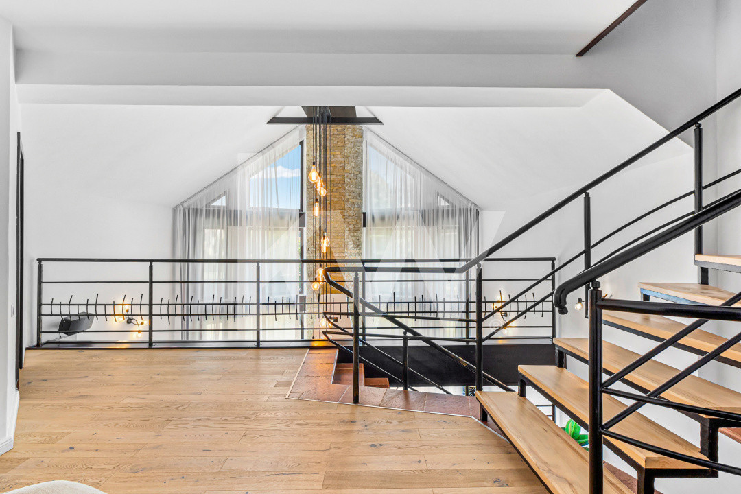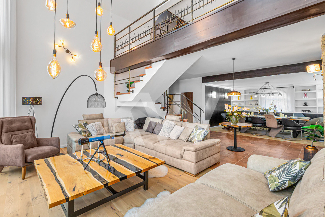 • Living cu tavan înalt de 6,5 metri și șemineu funcțional care încălzește spațiul