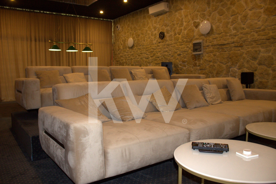 • Sală de cinema complet echipată (ecran 4K adus din SUA, sistem audio 7.1, subwoofer, stație cu Alexa, efect „cer înstelat” cu senzor, izolație fonică, canapele pe comandă din Italia)